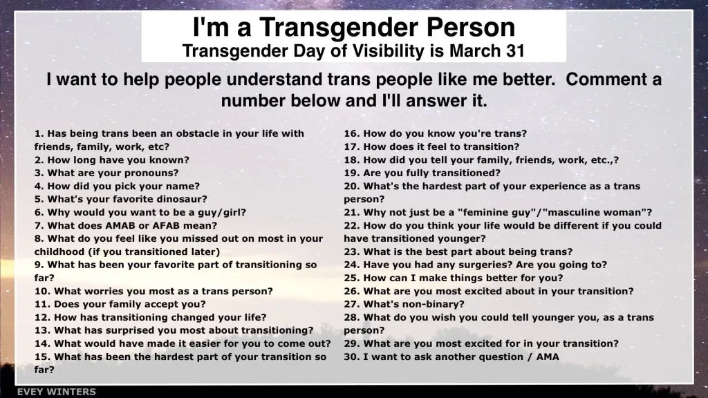 So, there will most likely be a lot of posts about my transition journey here eventually, until then I can bring this thing over from my previous blog, where I came out to my readers and let them ask me questions from a meme-list!